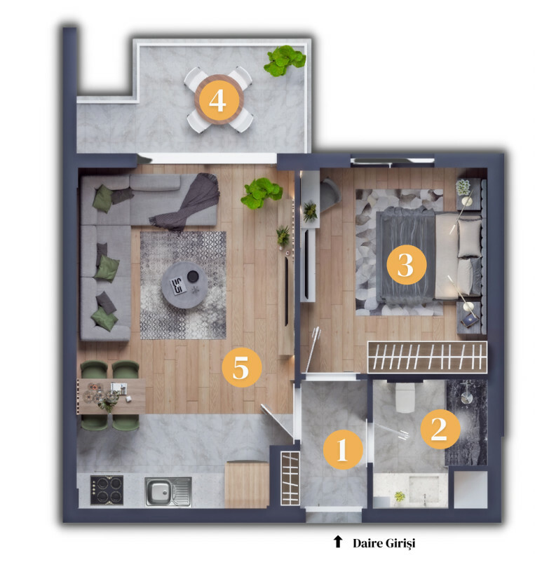 Квартиры 1+1 спроектированы просторно и практично: спальня, гостиная, американская кухня, ванная комнаты и балкон площадью 7,40 м² с видом на бассейн и ландшафт.